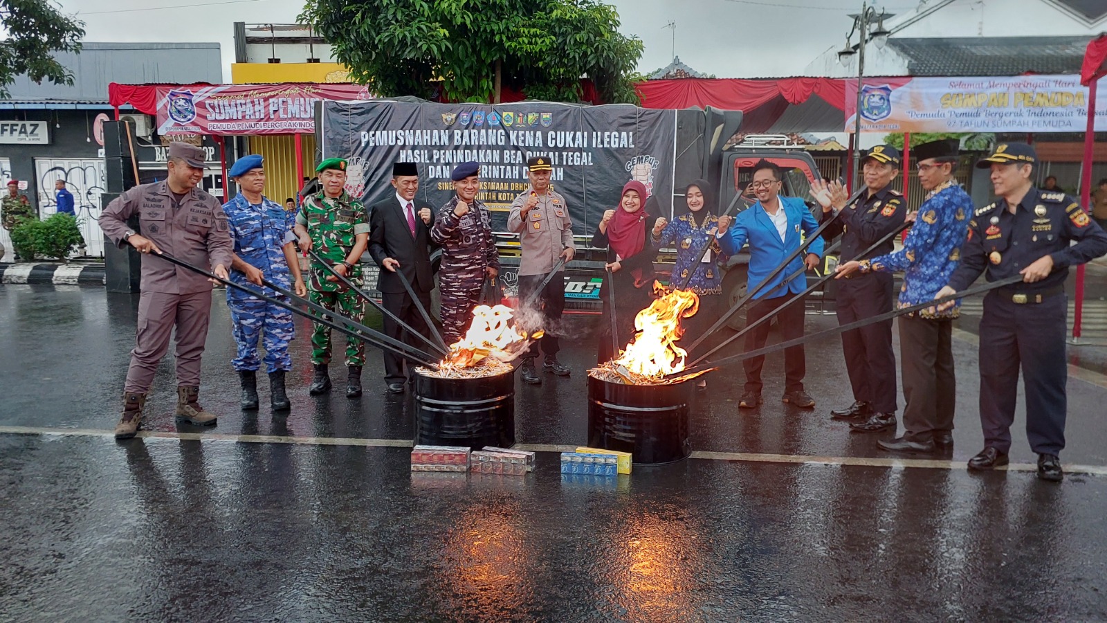 KOTA TEGAL, DN-II Pemerintah Kota Tegal bersama Kantor Bea Cukai Tegal melaksanakan pemusnahan secara simbolis sebanyak 5.267.876 batang rokok illegal dengan nilai barang sekitar Rp7,72 miliar dan potensi kerugian negara sebesar Rp5,07 miliar pada rangkaian Upacara Peringatan Hari Sumpah Pemuda ke-97 Tahun 2025 di Jalan Pancasila, Kota Tegal, Selasa (28/10/2025).