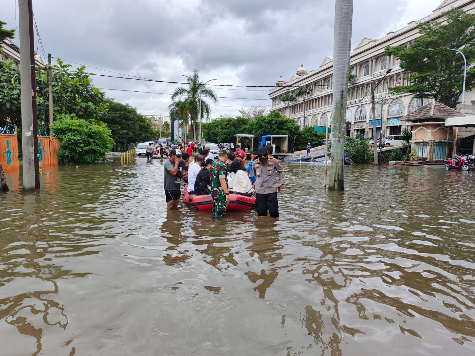 Dengan mengenakan seragam lengkap, para personel kepolisian turun langsung ke lokasi, membantu warga menggunakan perahu karet untuk memastikan mereka bisa dievakuasi dengan aman.