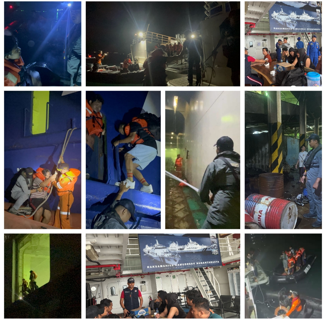 Banten, LIDIKKRIMSUS – II Kapal Negara (KN) Tanjung Datu-301 milik Badan Keamanan Laut Republik Indonesia (Bakamla RI) berhasil mengevakuasi 12 anak buah kapal (ABK) KMP Mutiara Ferindo 2 yang mengalami kebakaran di Perairan Banten pada Kamis dini hari, Banten (3/4/2025).