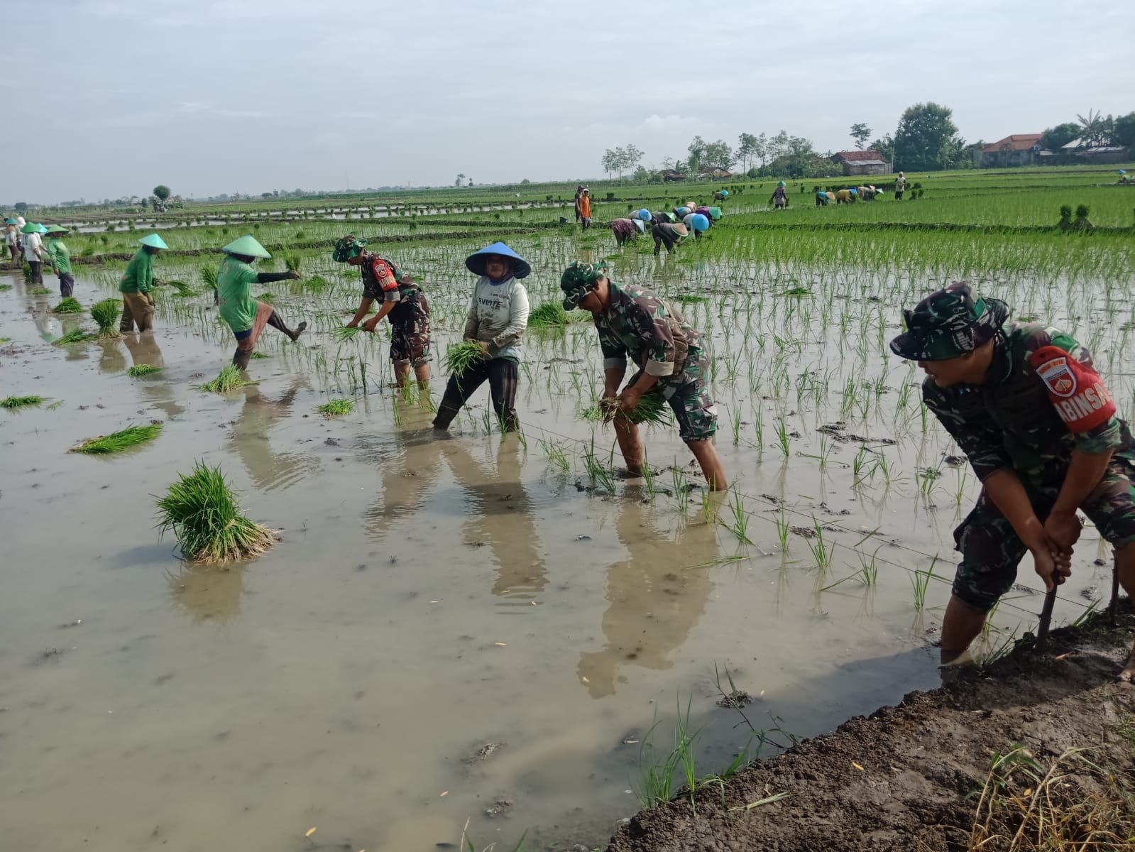 Brebes, DN-II Babinsa Koramil 07/Bulakamba Serma Manaf membantu petani menanam bibit padi dilahan baku seluas 2,5 Ha, dalam rangka program ketahanan pangan bertempat di Desa Bukakamba, Kec. Bulakamba, Kab. Brebes, Rabu (22/1/2025).