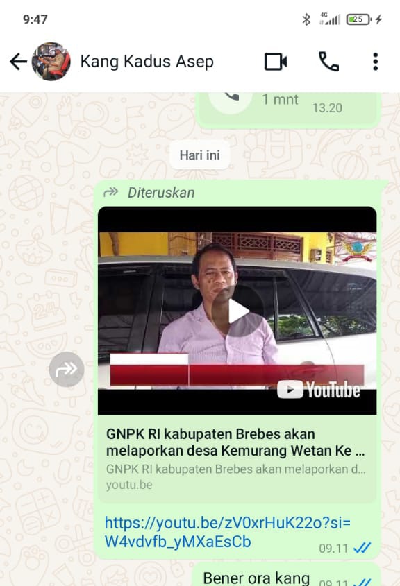 Jatang, DN-II SANRAnews (Brebes) Telah Tersebar screenshoot percakapan Kepala dusun desa kemurang wetan kecamatan tanjung brebes yang menyatakan tanggapannya tentang berita “GNPK RI kabupaten Brebes akan melaporkan desa kemurang wetan ke kejaksaan negeri Brebes”.