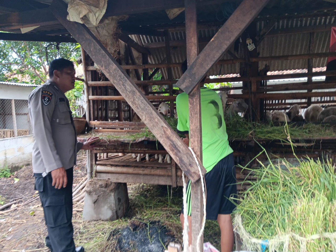 Brebes, DN–II Personil Polsek Bulakamba Polres Brebes Bripka Sutarno melakukan pengecekan ke Kandang kambing milik Bpk Maman alamat Desa Bulakamba Kec. Bulakamba Kab. Brebes guna waspadai wabah PMK pada peternak hewan di wilayah Kecamatan Bulakamba Kabupaten Brebes, Sabtu (11/01/2025).