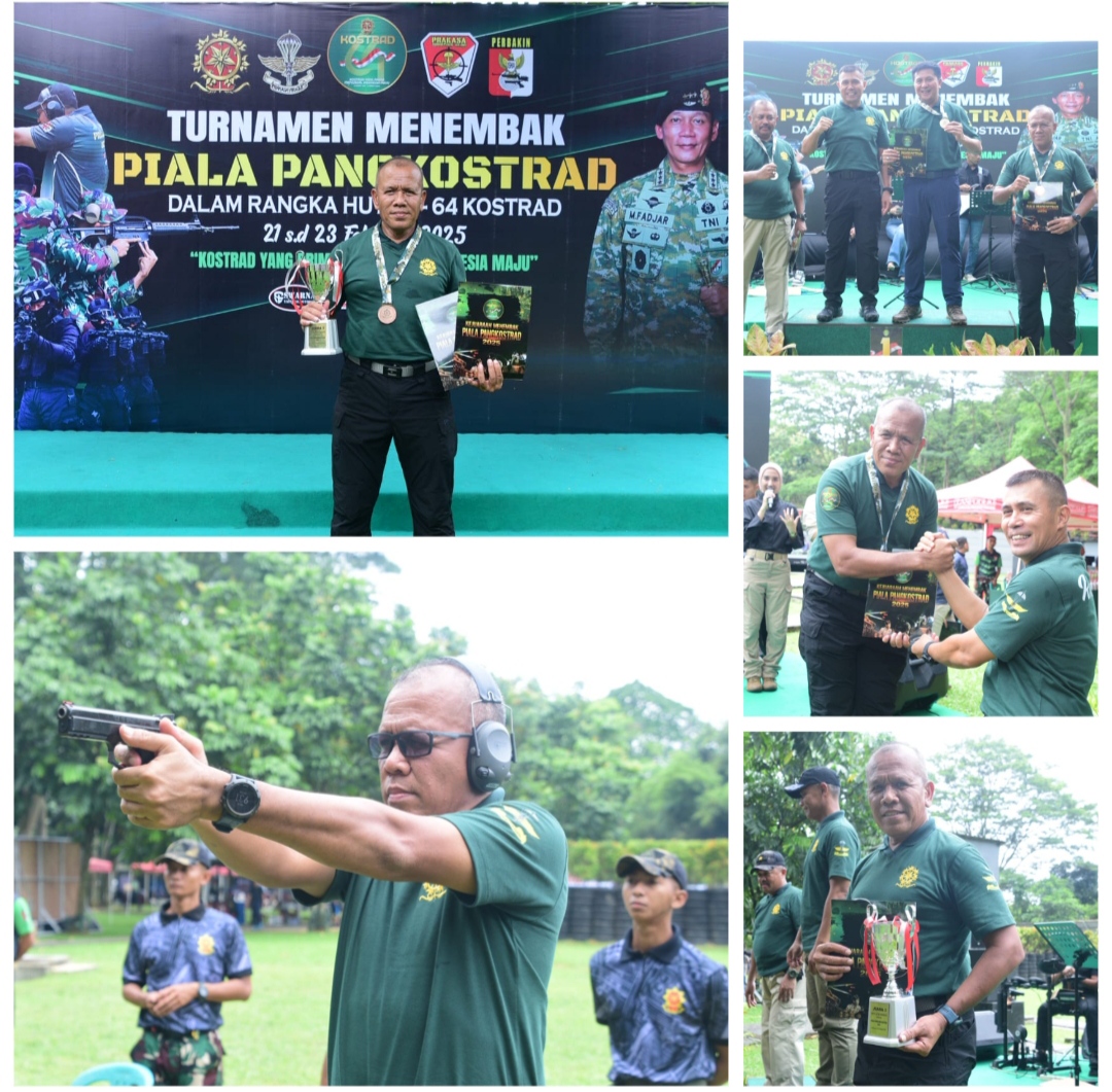 DEPOK, DN-II Usai minggu lalu berhasil meraih Runner Up pada Kejuaraan Menembak Dankopasgat Cup Tahun 2025, kali ini Komandan Pasmar 1 (Danpasmar 1) Brigjen TNI (Mar) Umar Farouq, S.A.P., CHRMP., M.Tr.Opsla., M.Han., berhasil memborong Juara 3 pada dua nomor yang berbeda pada Kejuaraan Menembak Piala Pangkostrad yang digelar di Prakasa Shooting Club, Jl. Raya Bogor KM. 39 Cilodong, Depok, Sabtu (22/2/2025).