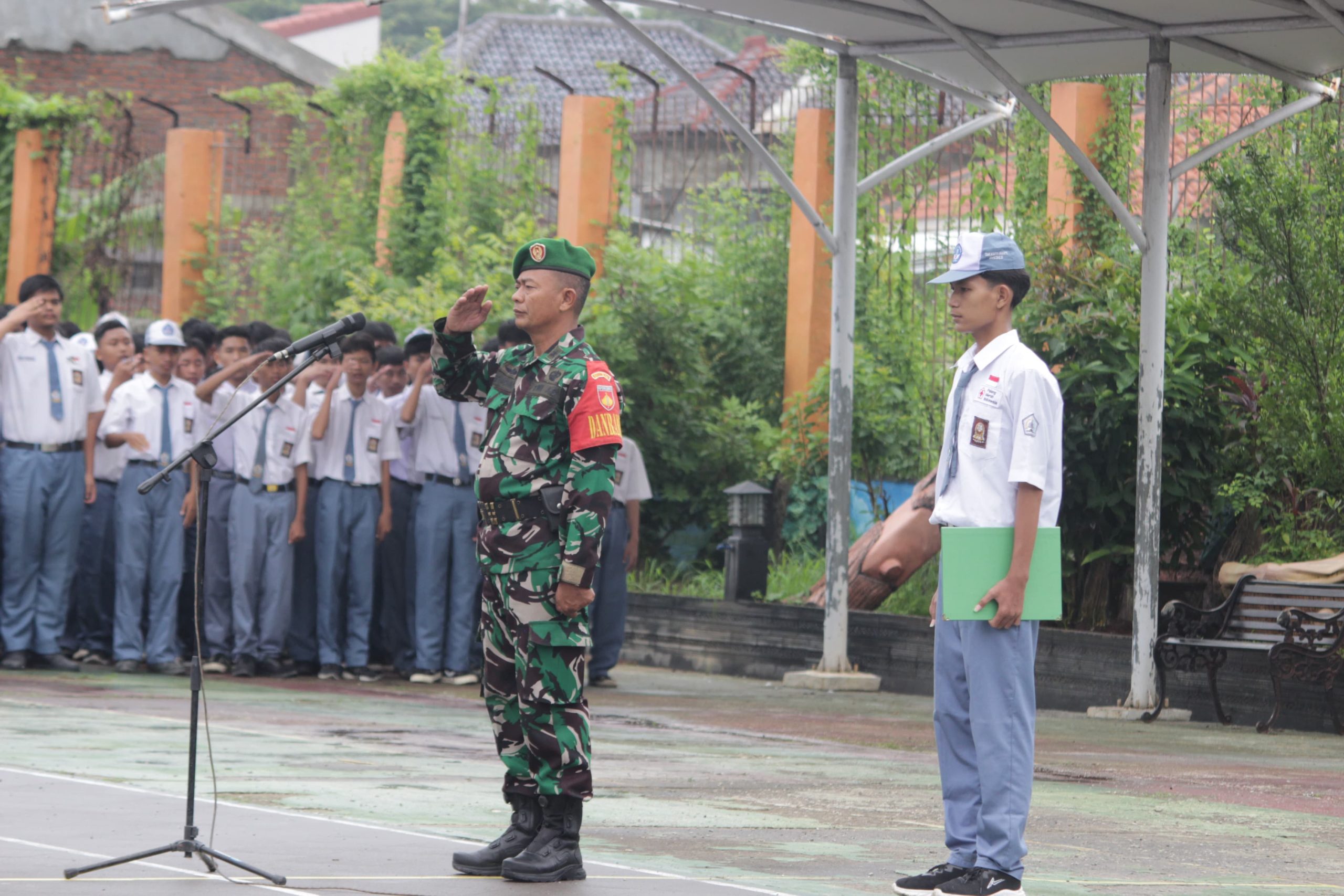 BREBES, DN-II Danramil 01/Brebes Kapten Arh Nediono bertindak sebagai Inspektur Upacara (Irup), pada pelaksanaan upacara bendera mingguan di SMK Karya Bhakti, Kecamatan Brebes, Kabupaten Brebes. Senin (03/02/2025).