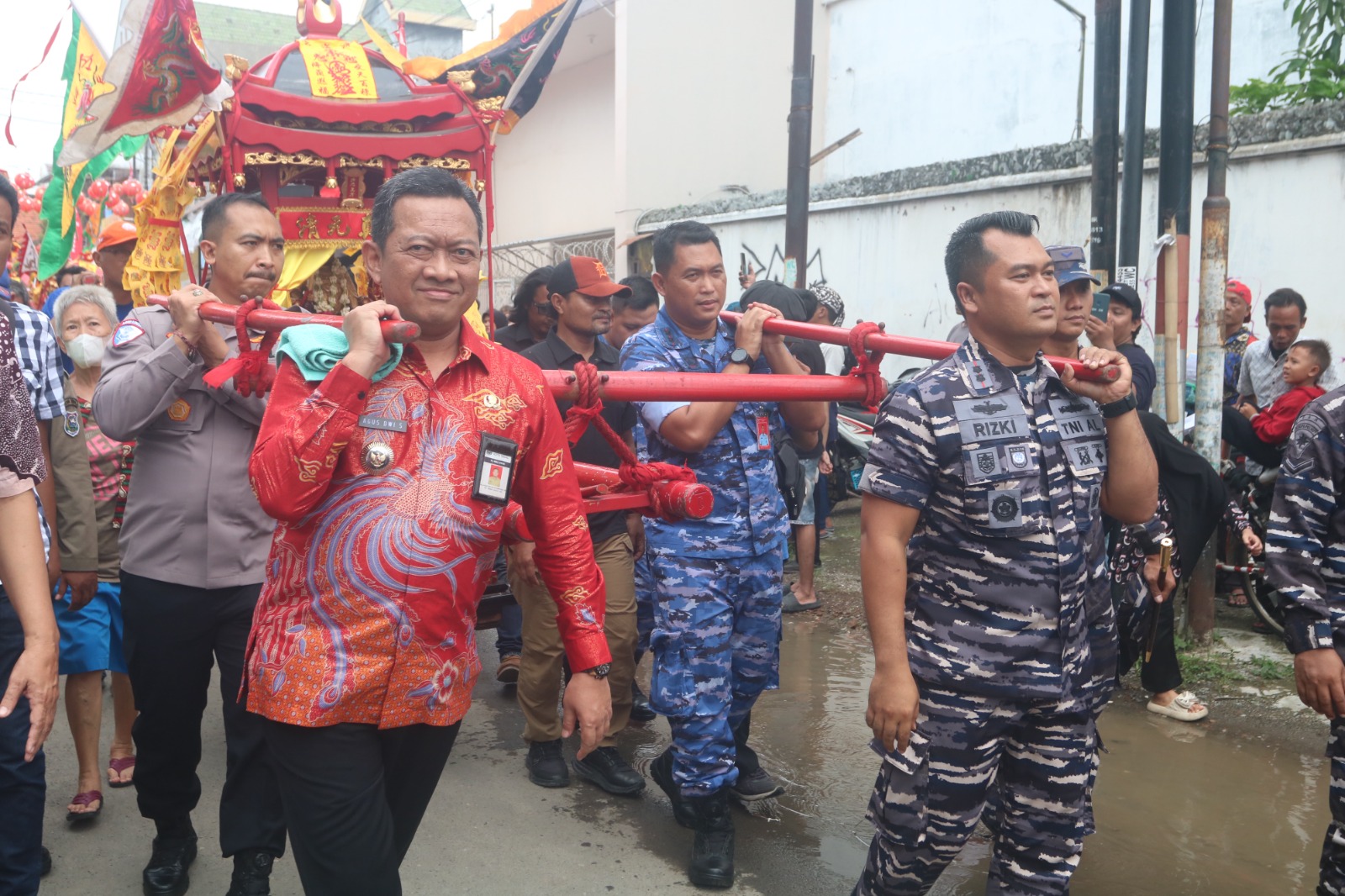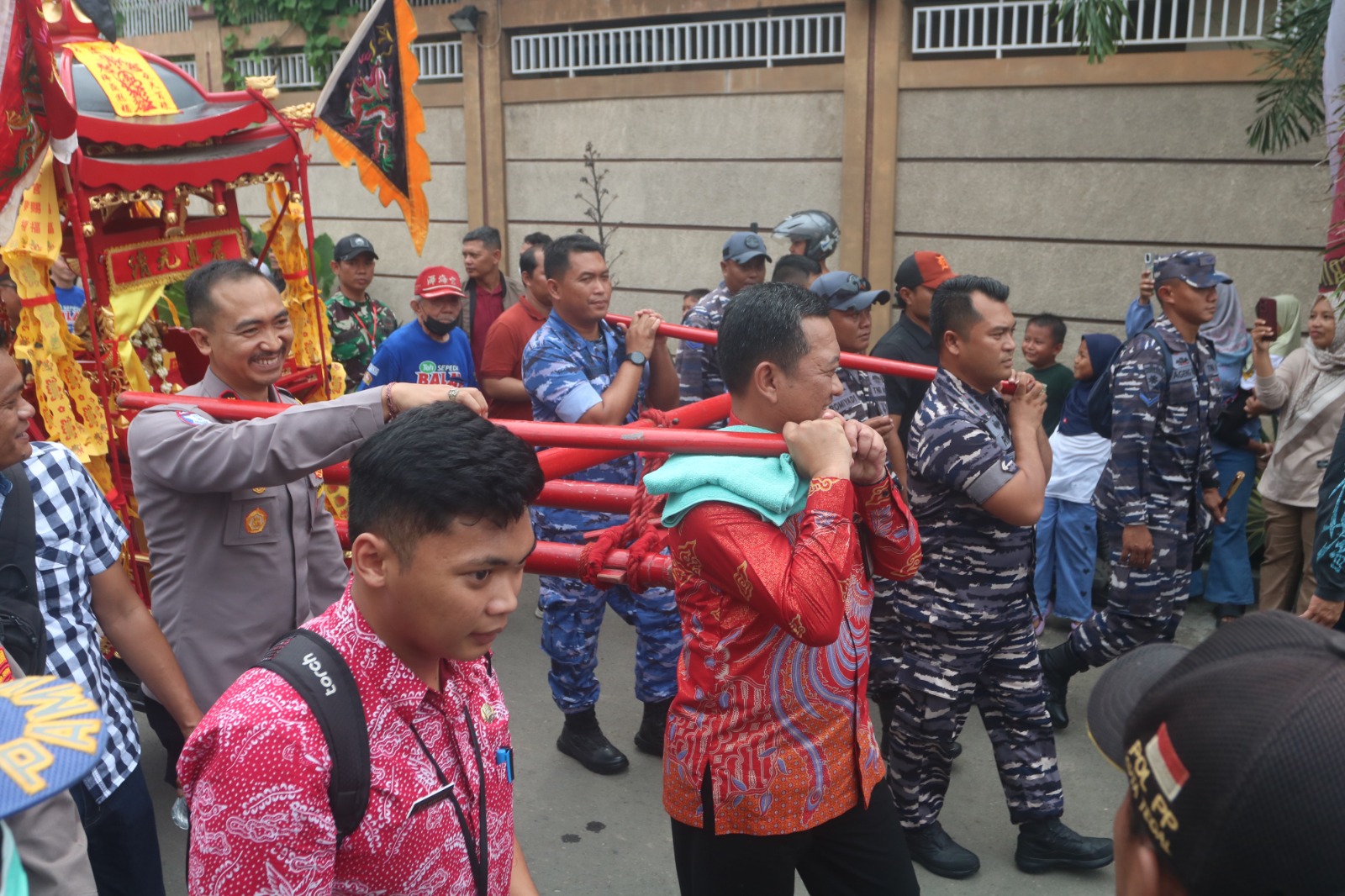 Kota Tegal, DN-II Forum Koordinasi Pimpinan Daerah (Forkopimda) Kota Tegal mengikuti pembukaan kirab Toa Pe Kong dengan ikut menggotong Toa Pe Kong bersama umat Konghucu, di Klenteng Tek Hay Kiong, Selasa (11/2/2025).