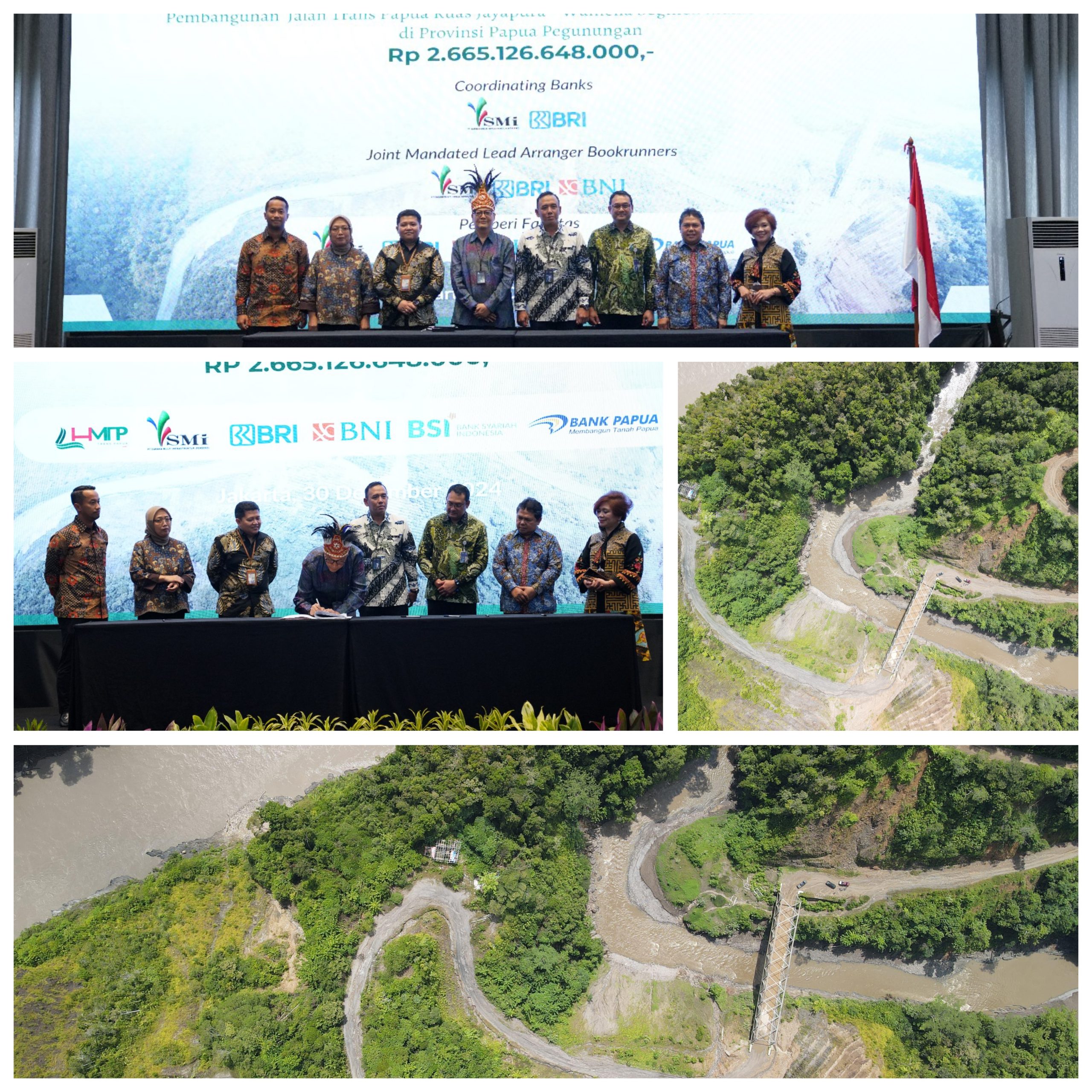 Jakarta, DN-II PT Hutama Mambelim Trans Papua (HMTP), Badan Usaha Pelaksana (BUP) yang dibentuk oleh Konsorsium antara PT Hutama Karya (Persero) (Hutama Karya) dan PT Hutama Karya Infrastruktur (HKI)telah menandatangani Perjanjian Pembiayaan Sindikasi Proyek Kerjasama Pemerintah dengan Badan Usaha (KPBU) Pembangunan Jalan Trans Papua Ruas Jayapura -Wamena Segmen Mamberamo-Elelim di Provinsi Pegunungan pada Senin (30/12) di Ballroom Gedung HK Tower, Jakarta.
