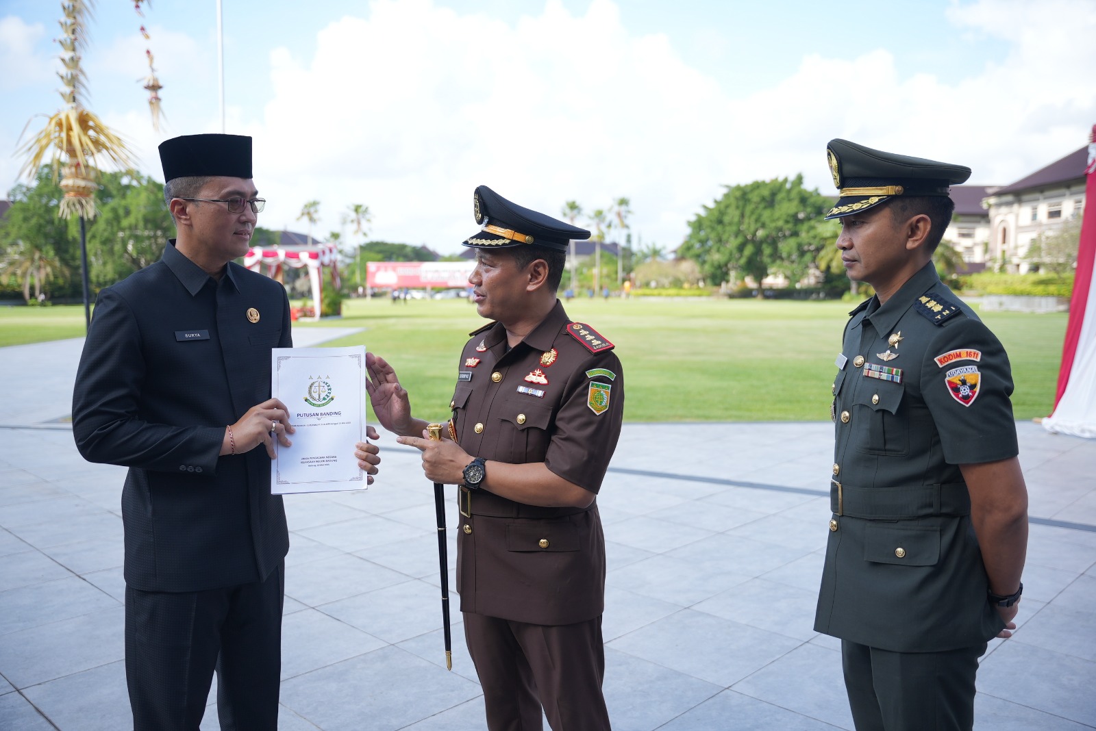 Bali, DN-II – II Pada hari Selasa tanggal 20 Mei 2025, bertepatan dengan Upacara Peringatan Hari Kebangkitan Nasional di Lapangan Mangupraja Mandala Pusat Pemerintahan Kabupaten Badung, Sutrisno Margi Utomo, S.H.,M.H., selaku Kepala Kejaksaan Negeri Badung bersama Tim Jaksa Pengacara Negara pada Kejaksaan Negeri Badung menyerahkan berkas kemenangan Banding dari Pengadilan Tinggi Tata Usaha Negara Mataram kepada Pemerintah Kabupaten Badung yang dalam hal ini diwakili oleh Dr. Ir. Ida Bagus Surya Suamba, S.T.,M.T., selaku Sekretaris Daerah Kabupaten Badung, disaksikan Forkopimda dan undangan yang hadir.