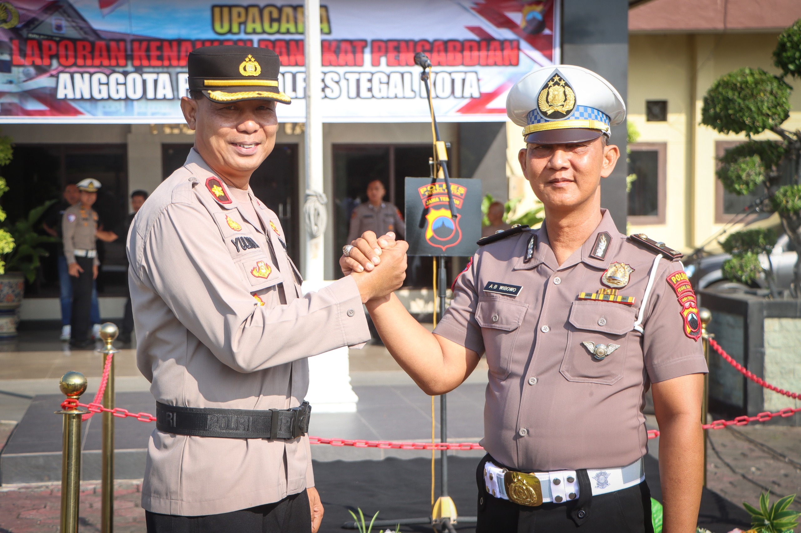 Kapolres Tegal Kota AKBP I Putu Bagus Krisna Purnama mengucapkan selamat atas kenaikan pangkat setingkat lebih tinggi kepada Aiptu AB Wibowo.