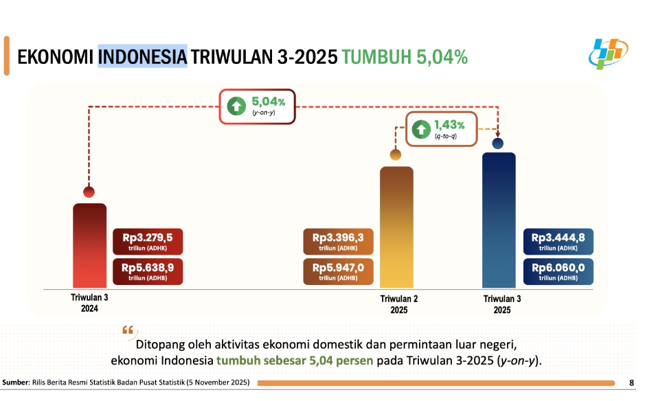 Jakarta, DN-II Di tengah ketidakpastian ekonomi global saat ini, ekonomi Indonesia masih tetap terjaga di kisaran lima persen. Badan Pusat Statistik (BPS) mencatat ekonomi Indonesia pada triwulan III-2025 tumbuh sebesar 5,04 persen year-on-year (yoy).