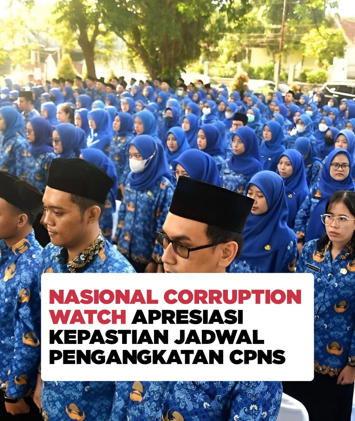 Jakarta, DN-II Keputusan pemerintah bersama DPR yang memberikan kepastian jadwal pengangkatan Calon Pegawai Negeri Sipil (CPNS) dan Pegawai Pemerintah dengan Perjanjian Kerja (PPPK) diapresiasi Wakil Ketua Umum Nasional Corruption Watch (NCW) Donny Manurung.