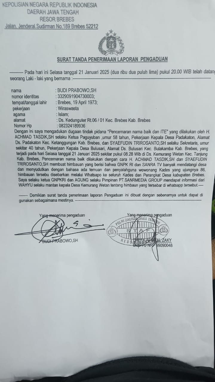 โKami melaporkan dua Kades atas dugaan pencemaran nama baik yang dilakukan oleh mereka,โ kata Budi Prabowo usai pelaporan, Selasa (21/1/2025) sore, di Mapolres Brebes.