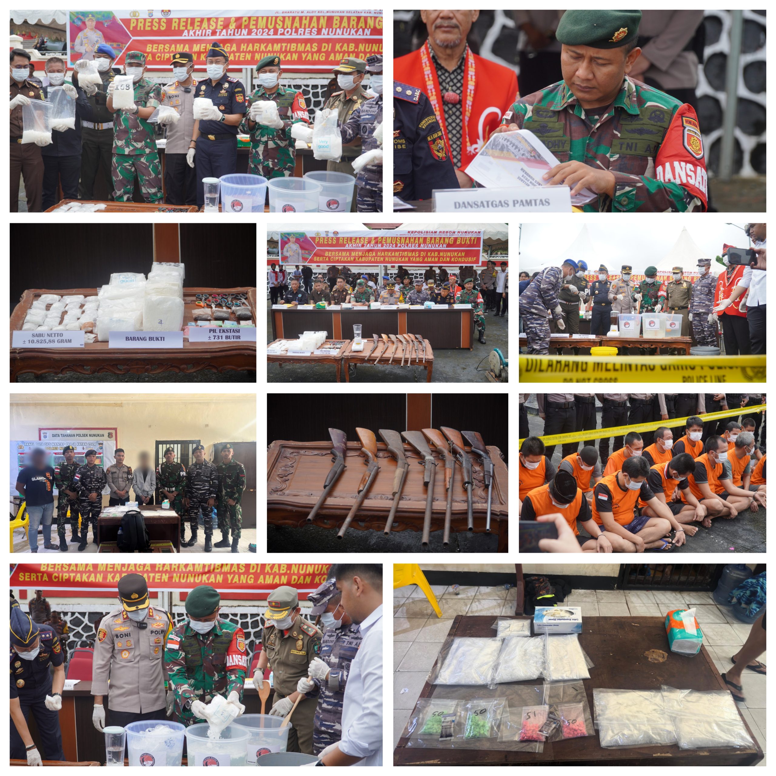 Nunukan, DN-II Komandan Satgas Pengamanan Perbatasan Yonarmed 11 Kostrad, Letkol Arm Gde Adhy Surya Mahendra, menghadiri acara pemusnahan barang bukti narkotika dan senjata rakitan yang digelar oleh Polres Nunukan. Dalam acara tersebut, barang bukti yang dimusnahkan meliputi sabu-sabu seberat 10.825 gram, 731 butir pil ekstasi, serta tujuh buah senjata rakitan jenis penabur. (31/12/2024).