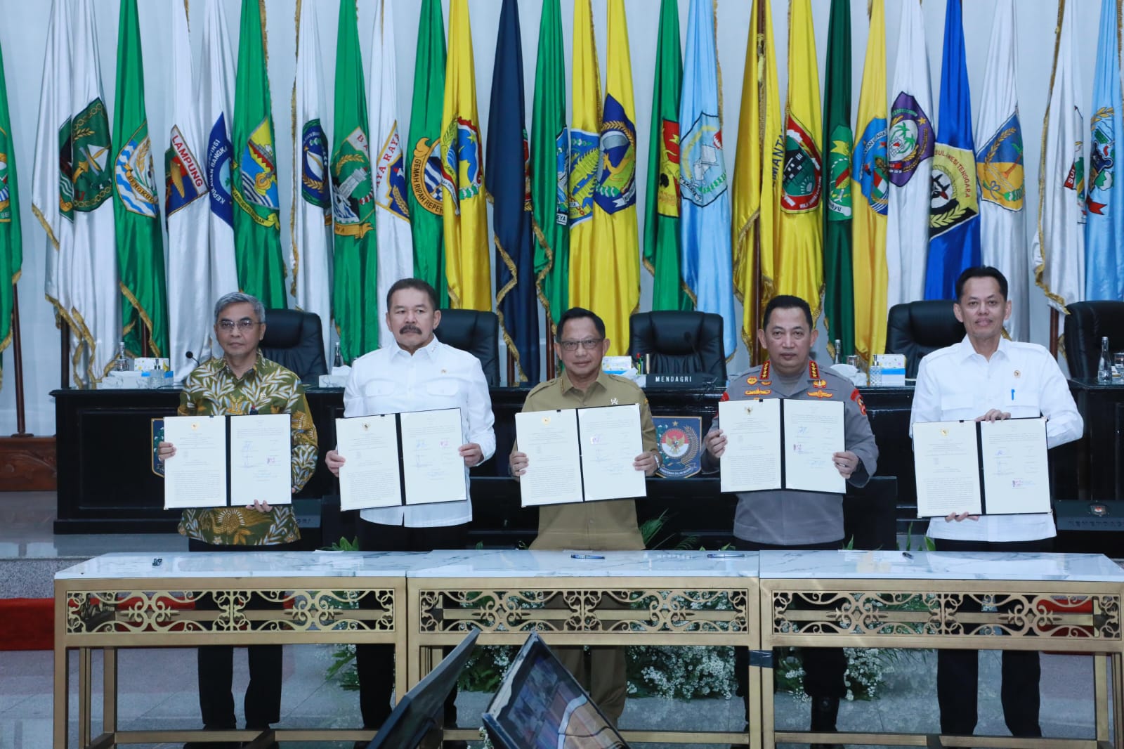 Jakarta, DN–II Menteri Dalam Negeri (Mendagri) Muhammad Tito Karnavian menandatangani Nota Kesepahaman tentang Kerja Sama dalam Pengawasan Penyelenggaraan Perizinan di Daerah. Penandatanganan itu dilakukan Mendagri bersama Jaksa Agung, Kapolri, Ketua Komisi Pemberantasan Korupsi (KPK), serta Badan Pengendalian Pembangunan dan Investigasi Khusus (BPPIK).