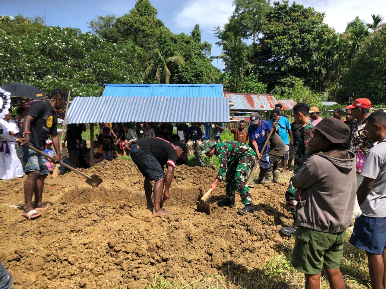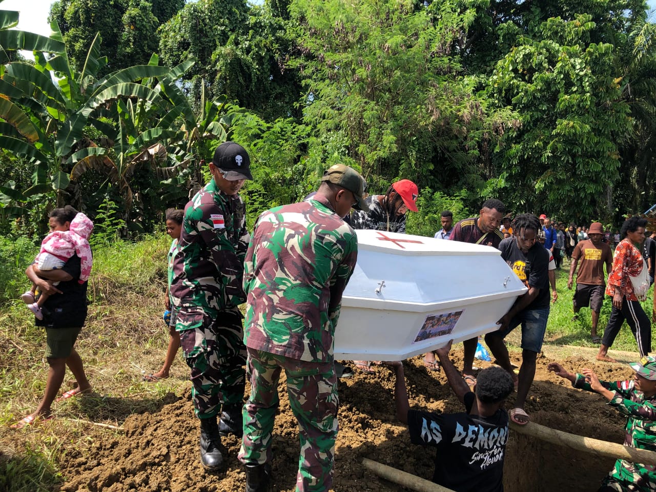 KEEROM, DN-II Dalam rangka pengabdian kepada masyarakat, Pos Yamara Satgas Yonif 131/BRS melayat dan membantu pemakaman Bpk. Denis Urpon (48 thn) Kepala Suku Oksibil bertempat di rumah duka Di Kp. Yamara, Distrik Waris, Prov.Papua, Kamis, (30/01/2025).