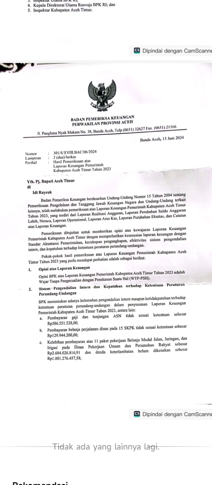 Temuan BPK ini menjadi ujian bagi Pemerintah Kabupaten Aceh Timur untuk membuktikan keseriusan mereka dalam membenahi pengelolaan keuangan daerah dan memastikan kepercayaan masyarakat tetap terjaga(Saiful Anwar)