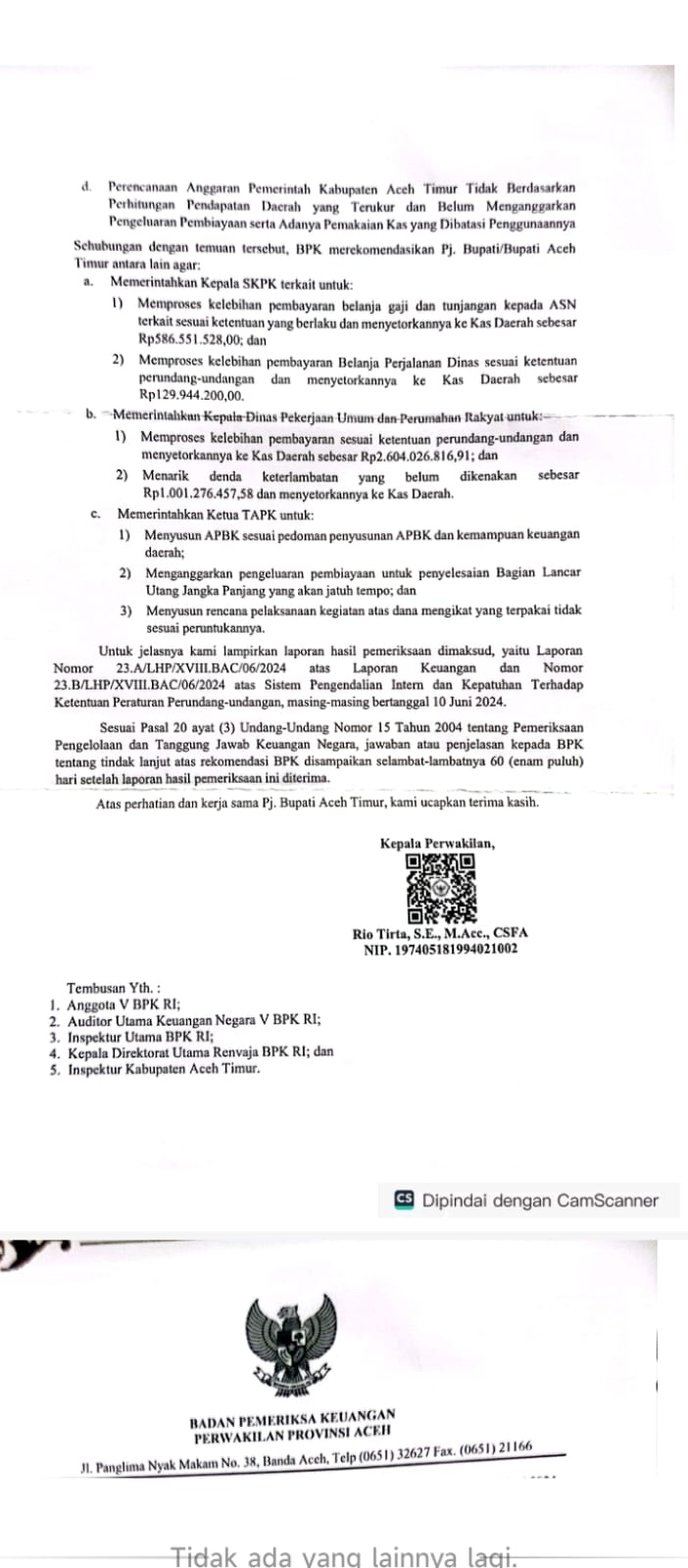 Surat Kepala Perwakilan BPK Provinsi Aceh Rio Tirta, S.E, M.Acc., CSFA yang di tujukan kepada Pj Bupati Aceh Timur