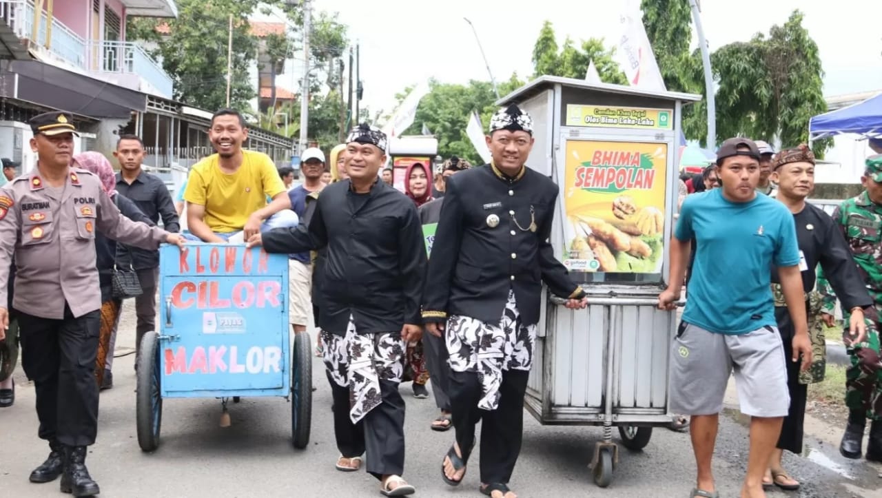 guna memberikan dukungan semangat, terlihat Agus Dwi bersama Danlanal Tegal, Letkol laut (P) Rizki Purnama Putra, Plt Sekda Sartono Eko dan perwakilan Forkompimda berjalan kaki beriringan dan membantu mendorong gerobak PKL.
