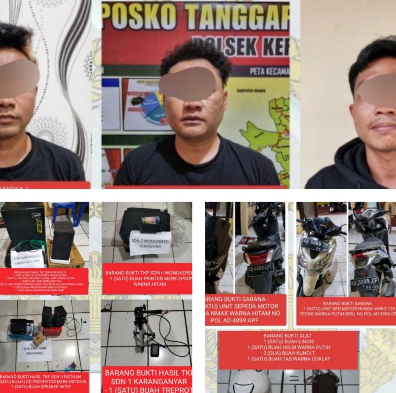 SRAGEN, DN-II Tim gabungan Unit Reskrim Polsek Karangmalang bersama Unit Resmob Polres Sragen berhasil mengungkap kasus pencurian dengan pemberatan yang terjadi di SDN Guworejo 3 desa Guworejo Kecamatan Karangmalang dan SDN Puro 3 Kecamatan Karangmalang Sragen.