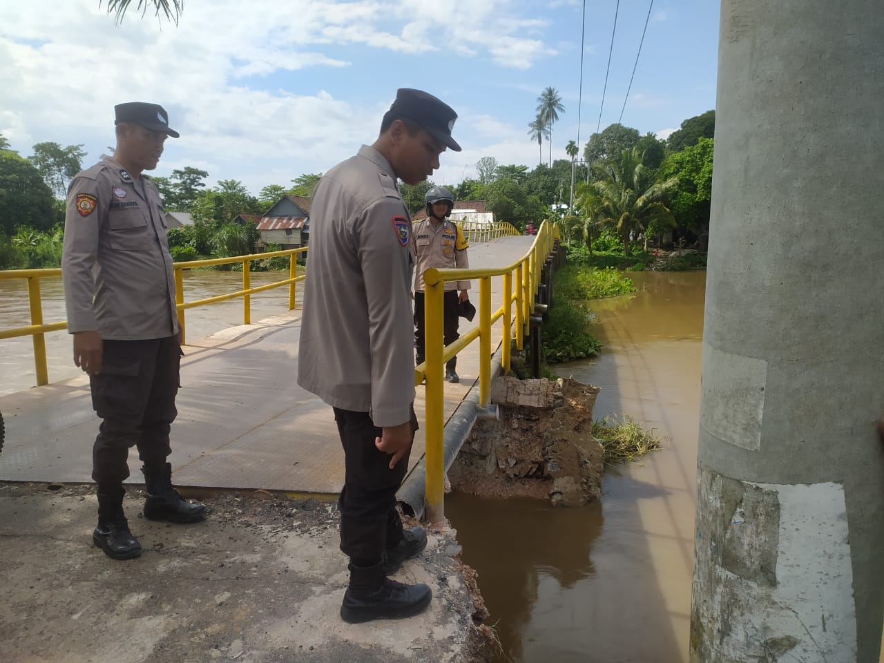Kapolsek Rantau Alai, IPTU Masyudhi, S.H., bersama anggota dan perangkat desa setempat, turun langsung ke lokasi pada Senin (10/3) untuk memastikan keselamatan masyarakat. Berdasarkan hasil pengecekan, jembatan tersebut masih dapat dilalui kendaraan roda dua, namun tidak dapat dilewati kendaraan roda empat karena kondisi kemiringan yang berisiko.