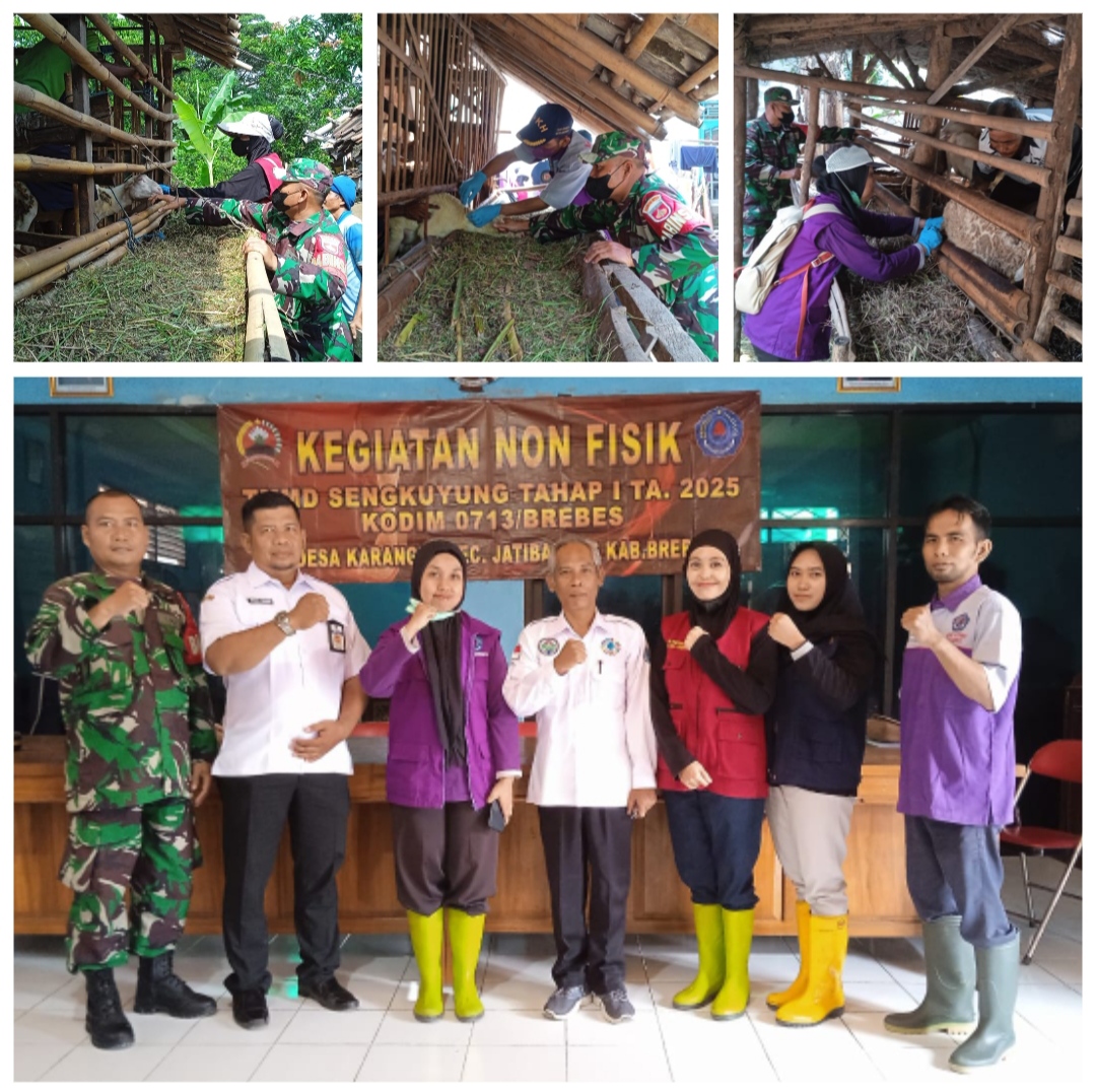 Brebes, DN-II Dinas Peternakan dan Kesehatan Hewan (DPKH) Kabupaten Brebes mengadakan pelayanan kesehatan hewan ternak secara Gratis dilokasi TMMD Sengkuyung tahap I Tahun 2025 Kodim 0713 Brebes, di Desa Karanglo, Kecamatan Jatibarang, Kabupaten Brebes. Rabu (5/3/2025).