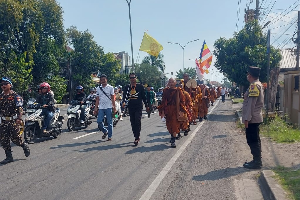 Kota Tegal, DN-II Puluhan biksu asal Thailand yang tengah melakukan perjalanan spiritual Thudong menuju Candi Borobudur, Jawa Tengah, Kamis (01/05) kemarin, melintas dan memasuki wilayah Kota Tegal