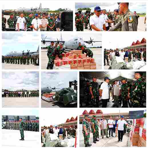 Rombongan diberangkatkan menggunakan pesawat Hercules milik TNI AU C-130J-30 Super Hercules A-1342, yang membawa muatan logistik seberat 12.240 Kg yang terdiri dari 30 Tenda dari Kemhan, Bahan makanan (Super Mie) dari Kemhan, Logistik BNPB, dan 1 Unit Truck Basarnas.